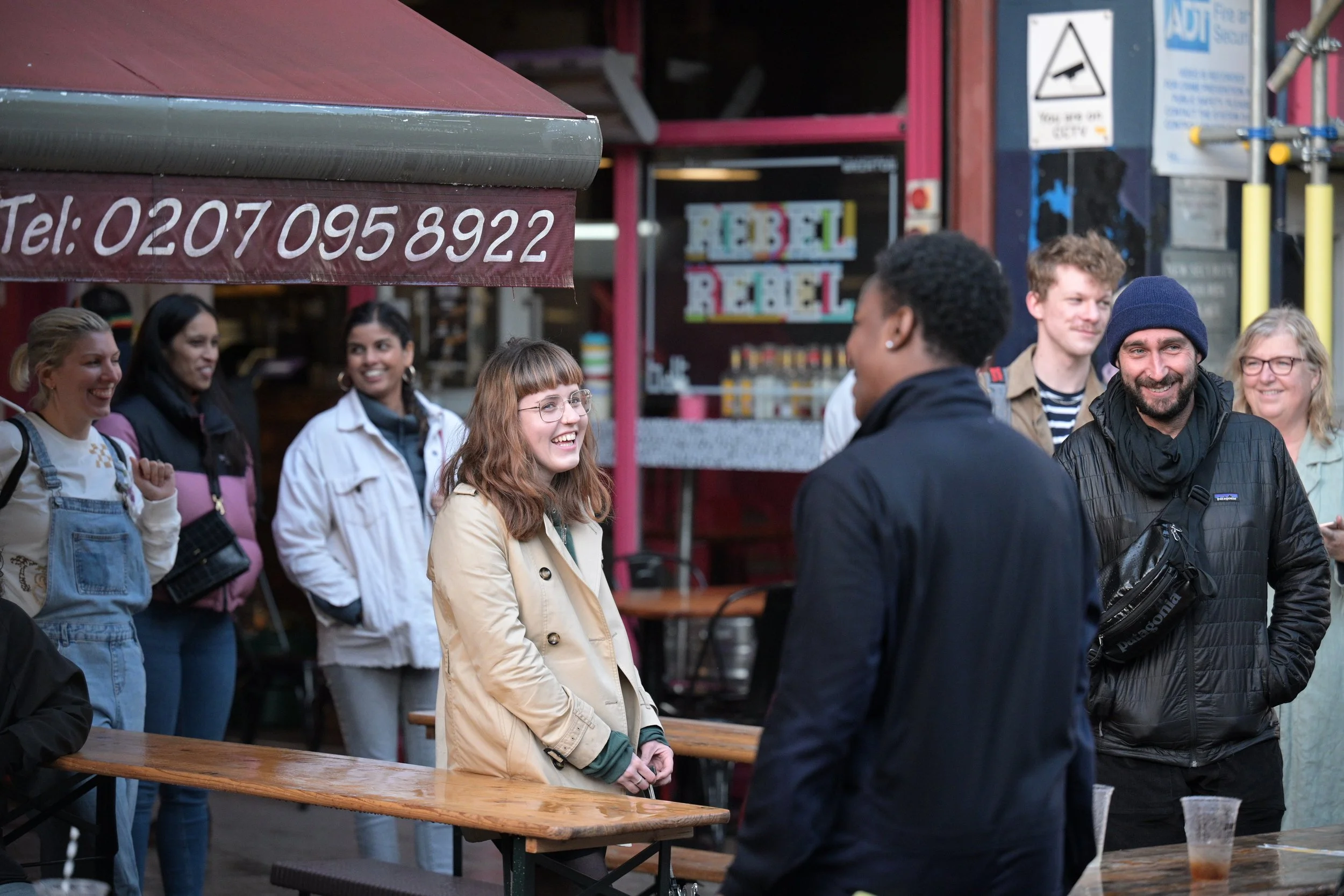 Audience members at Brixton Market in October 2021 meeting the creatives after the performance. Despite the rain there was an immense sense of joy and connection as many stayed for long after the final bow of the launch season!